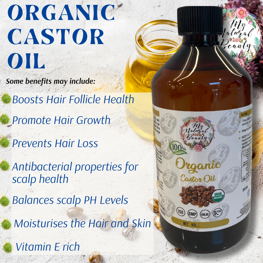 »Promote Shiny and Healthy Hair: Organic Castor oil may promote natural hair growth and thicker, stronger, and shinier hair.  It has been used for maintaining the natural colour of the hair. Castor oil boosts blood circulation scalp helping the hair to retain its natural colour pigment and condition. Moreover, the omega 6 fatty acids may help to slow down the formation of grey hairs. Castor Oil is used to treat dry, itchy scalps & dandruff.